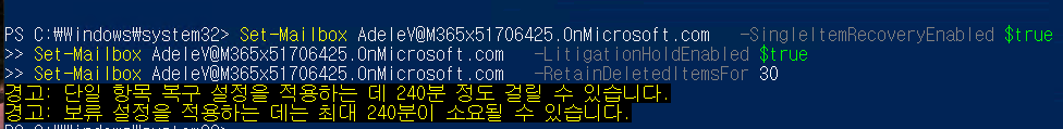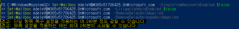4. 담음으로 Exchange Online에 설정된 보존정책을 제거하기 위해 아래 명령어를 순서대로 입력합니다. (설정이 적용되기까지 240분이 소요될 수 있다고 표기됩니다)